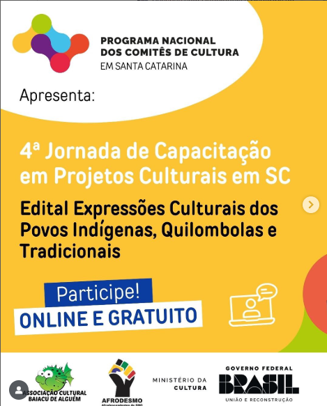 Dirigida para agentes culturais indígenas, quilombolas ou de povos tradicionais do estado de Santa Catarina, foi realizada na modalidade online com 3h de formação.