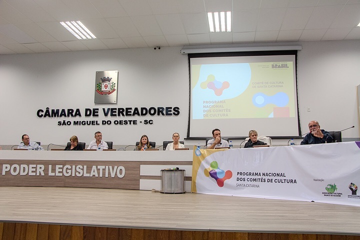 Ação realizada na Câmara Municipal de Vereadores de São Miguel do Oeste, para apresentação do CCSC aos representantes da região Oeste de Santa Catarina. A atividade teve início com uma mística preparada pela equipe Afrodesmo, onde destacaram-se elementos da diversidade, da defesa dos povos, da mãe-terra, com percussão, dança e fala a respeito. Além da presença de diferentes segmentos culturais, autoridades, movimentos sociais, artistas, a mesa foi composta por representante do Ministério da Cultura em SC e abriu-se um grande diálogo para que as pessoas dos mais de treze municípios ali presentes pudessem expressar suas angústias, dúvidas e esperanças nesse momento em que o estado possui um Comitê de Cultura organizado em uma grande rede coletiva.