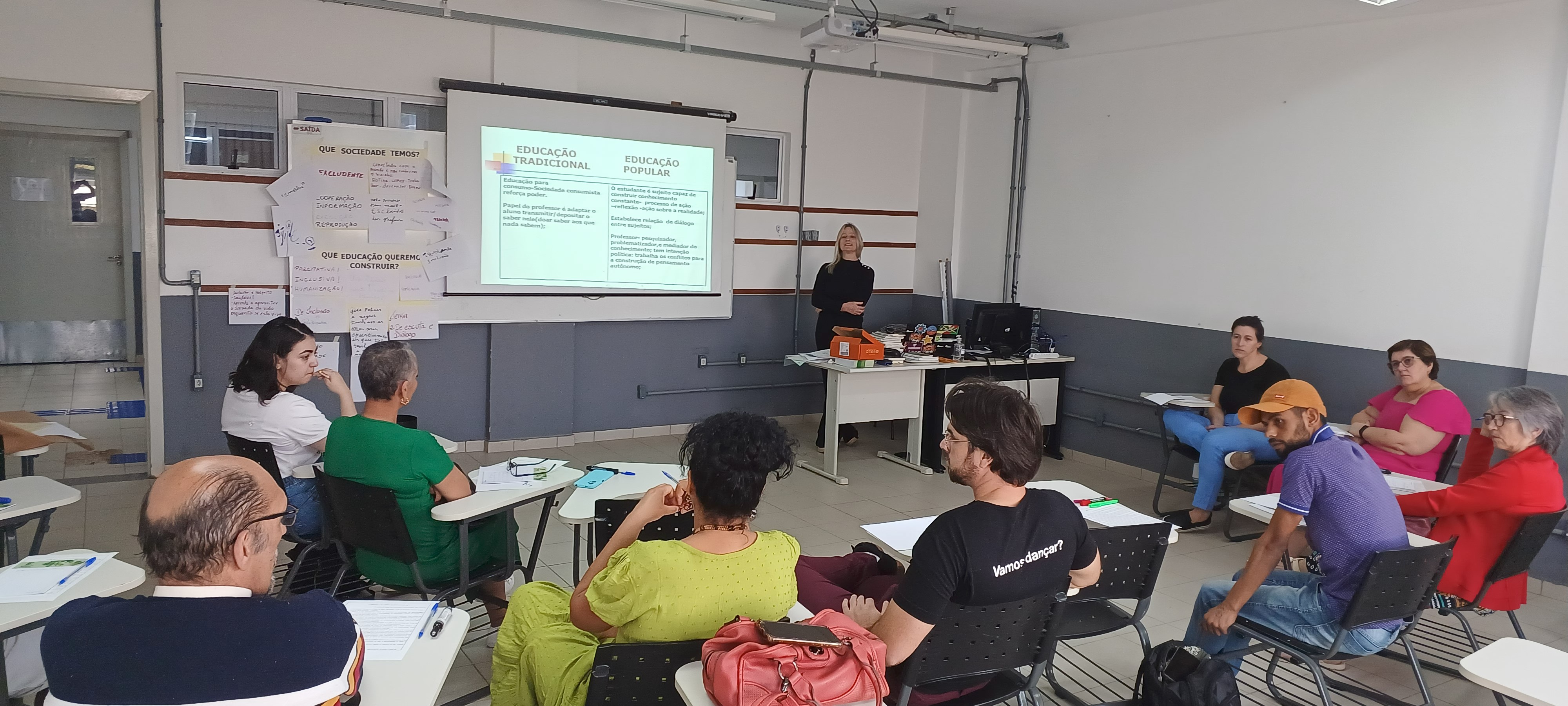 Educação Popular e cultura dos territórios: Maria Helena Mosquem trouxe na oficina sobre Educação popular e cultura dos territórios, um histórico da educação popular, mas especialmente, trabalhou a partir da realidade dos/as que estavam na oficina, utilizando materiais didáticos para que todos/as escrevessem em folhas e partilhassem suas escritas, dialogassem uns com os/as outros/as. Nessa troca, vários livros foram partilhados em PDF para quem quisesse seguir com as leituras posteriormente.
